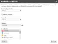 El Asistente de re-asignación de oportunidades le permite re-asignar el responsable de oportunidad, el responsable de empresa, el territorio y el identificador al mismo tiempo.