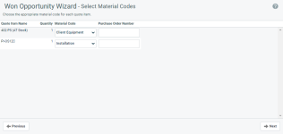 Seleccione un código de material para los elementos de cotización que tengan asignado un código de material incorrecto o carezcan de él. Consulte Buscar y gestionar productos para más información sobre cómo asignar códigos de material. |