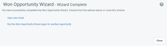 La página final del Asistente presenta vínculos a todos los elementos creados por el Asistente. Haga clic en un vínculo para abrir un proyecto activado, un contrato de servicio recurrente, un ticket o un pedido de venta. Hay también un vínculo para ejecutar el Asistente para cerrar oportunidades nuevamente para otra oportunidad.