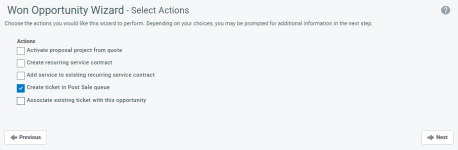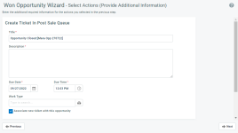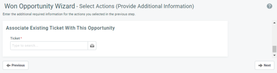 Si la oportunidad está asociada a un ticket o el Asistente para Oportunidades Ganadas se ejecutó desde el Administrador de Cotizaciones de Kaseya (anteriormente Datto Commerce) (que creará un ticket), el ticket existente estará preseleccionado.