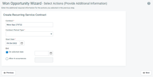 Esta sección le pide que introduzca la información necesaria para el contrato de servicio recurrente que se creará cuando finalice el Asistente. Este contrato estará vinculado a la oportunidad desde la página Resumen del contrato.