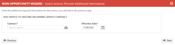 - La organización de la oportunidad tiene un contrato de servicio recurrente activo. La fecha de entrada en vigencia que especifique debe estar dentro del intervalo de fechas del contrato seleccionado.