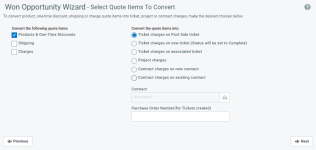 En esta página, usted selecciona los tipos de elementos de cotización que desea convertir en cargos asociados a un ticket, proyecto o contrato nuevos o existentes, para que puedan ser facturados al cliente. No seleccione ninguna casilla de acción, o bien seleccione una o más de estas.