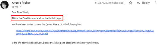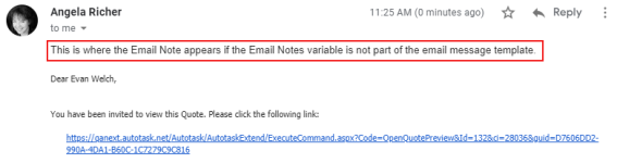 Notas de correo electrónicoEste campo aparece en las páginas Configuración de cotización y Cotización > Publicar. Le permite añadir comentarios personalizados o información adicional específica a la organización a un mensaje de correo electrónico de cotización cuando usted usa una plantilla de mensaje de correo electrónico. El contenido del campo Notas de correo electrónico también brinda el contenido para la variable [Cotización: Notas de correo electrónico].
