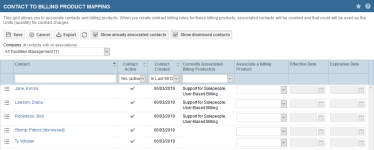 | Productos de facturación actualmente asociados | Si seleccionó "Mostrar contactos/elementos de configuración ya asociados", esta columna mostrará los productos de facturación con los que están asociados los elementos. Seleccione un producto de facturación en el que filtrar. |