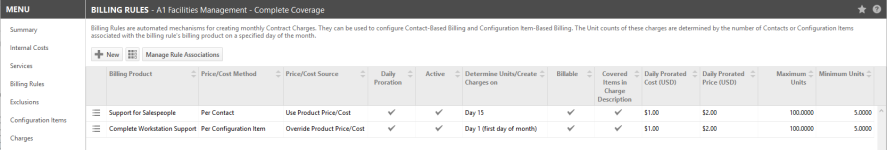 A las reglas de facturación de contratos se accede desde el menú de contrato haciendo clic en el vínculo Reglas de facturación. Una cuadrícula presenta una lista de todas las reglas de facturación que se han creado para este contrato.