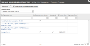 | Selector desplegable de productos de facturación | Si hace clic en Administrar asociaciones de reglas, se preseleccionará el primer producto de facturación que aparezca en la cuadrícula. Si selecciona Ver/Administrar asociaciones desde el menú contextual, se preseleccionará el producto de facturación actual. Todos los contactos o dispositivos asociados a la organización del contrato se muestran en la tabla. |