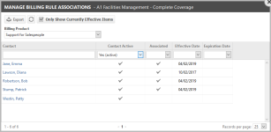 | Asociado | Presenta una marca de verificación si el contacto o el elemento de configuración está actualmente asociado con el producto de facturación de la regla de facturación seleccionada. |