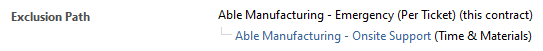 Esta sección presenta una jerarquía escalonada de contratos que son el contrato de exclusión para el contrato que está viendo, o un contrato de exclusión para el contrato de exclusión. Primero, se aplica el contrato de exclusión, y si no se permite la función o el tipo de trabajo bajo el contrato de exclusión, se aplica el contrato de exclusión del contrato de exclusión. Esto también se denomina como árbol de exclusión. Consulte Exclusiones de contrato.