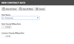 La Tarifa contractual de facturación por hora es de manera predeterminada la tarifa estándar de sólo lectura para la función seleccionada. Para modificar la función para un contrato de tiempo y materiales, anticipo o precio fijo, haga lo siguiente: