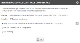 | Establecer el contrato como fuera de norma | Seleccione esta opción para mantener el mismo número de unidades pero configurar el contrato como fuera de norma. Su gestor de contratos puede editar más tarde el servicio o el paquete de servicios para agregar unidades y hacer que el contrato vuelva a estar en cumplimiento con la norma. |