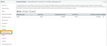 En la página Cargos predeterminados, es posible sobrescribir el costo unitario, el precio unitario y la configuración Facturable establecidos en el módulo Admin., y configurar los niveles de precio específicos al contrato para códigos de material usados con el contrato. Usted incluso puede usar cargos predeterminados para hacer no facturables las compras de bloque horario, de anticipo y de incidentes.