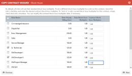 Esta página muestra una lista de todas las funciones en su organización y el multiplicador de bloque horario predeterminado para cada función. Aquí puede bloquear el Multiplicador de bloque horario por función actual de una función o especificar un Multiplicador de bloque horario de contrato para cada función.