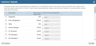 Esta página muestra una lista de todas las funciones en su organización y la tarifa de facturación predeterminada para cada función. Aquí puede bloquear la tarifa de facturación por hora actual de una función o especificar una tarifa de facturación por hora de contrato diferente para cada función.