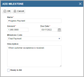 | Descripción | Ingrese una descripción del objetivo que debe ser alcanzado antes de que el hito se vuelva facturable. |