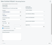 Tipo de período del contratoEl campo Tipo de período aparece en entidades donde puede configurar el incremento de tiempo entre pagos. Determina la frecuencia de facturación. Sólo en los servicios recurrentes, seleccione entre: Mensual (predeterminado), Trimestral, Semestral y Anual. IMPORTANTE No podrá cambiar el tipo de período del contrato luego de guardar el contrato. |