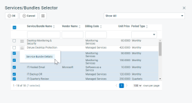 Haga clic en Agregar servicios/paquetes. Se abre la página Selector de servicios/paquetes. Contiene una lista de todos los servicios y paquetes de servicios que su administrador haya configurado.