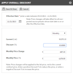 | Descuento (%), Cambio de precio y Precio (tras el descuento) | Los campos Descuento (%), Cambio de precio y Precio están vinculados. La información ingresada en uno de los tres campos se reflejará en los otros dos. Usted puede configurar su descuento por porcentaje, importe o precio indicativo. Por ejemplo, si usted tiene un contrato mensual con un precio de lista actual de $500 y usted ingresa 10.00 en el campo Descuento (%), el Cambio de precio mensual mostrará -50.00 y el Precio mensual tras el descuento será $450. En cambio, si usted tiene un contrato mensual con un precio de lista actual de $500 y usted ingresa -50.00 en el Cambio de precio mensual, el campo Descuento (%) mostrará 10.00. |