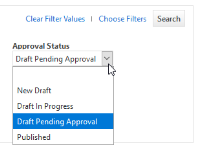 Esto facilita que los usuarios encuentren sus propios borradores y que los supervisores encuentren los elementos que requieren aprobación. Para ubicar un elemento, seleccione uno de los siguientes estados de aprobación: