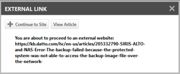Para introducir el concepto de base de conocimientos global, Datto ha creado referencias a los artículos de la base de conocimientos de BCDR en la base de conocimientos de Datto. Desde el punto de vista de Autotask, esta es una base de conocimientos externa, lo que significa que el contenido del artículo no se originó en Autotask, o no se importó ahí. Para una discusión de los tipos de contenido de la Base de conocimientos, consulte Vínculo de referencia.