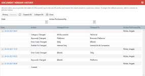 Las páginas Historial de artículos e Historial de documentos mantienen un registro de los cambios en campos específicos. Las ediciones no se agrupan en versiones. Para obtener una lista completa de los campos que se rastrean, haga clic en el selector de campos, o consulte Historial de artículo e historial de documento.