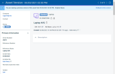 - Aparece una versión simplificada de la página. La vista previa contiene los valores de los campos, el formato y las imágenes de la versión guardada anteriormente. Se quitan los campos y las secciones que no se ven afectados por una reversión (elementos relacionados, pestañas accesorias). En la parte superior aparece una barra de mensajes que identifica la versión.