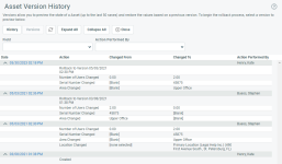 - Haga clic en Finalizar reversión. La versión anterior seleccionada se convierte en la versión actual. En la página del historial de versiones, la reversión se registra en la columna Acción, junto con los cambios en cualquier campo.