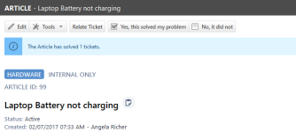 Si abrió el artículo desde la página Soluciones Sugeridas y si el artículo fue efectivamente una solución para el ticket, tiene la opción de relacionar el ticket con el artículo. Consulte Encontrar una solución desde un ticket. |