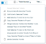 | Llamada de servicio/Agregar tickets seleccionados a llamada de servicio | Permite al usuario agregar el ticket a una llamada de servicio existente o crear una nueva llamada de servicio y agregar el ticket. Consulte Crear y gestionar llamadas de servicio desde una tarea o ticket. |
