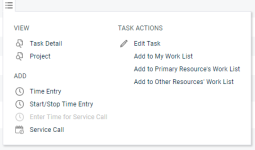 | Agregar a la lista de trabajo del recurso principal | Le permite agregar la tarea a la lista de trabajo del recurso principal. Si la tarea no tiene ningún recurso principal asignado, esta opción estará deshabilitada. Consulte Usar listas de trabajo. |