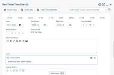 Desde un ticket abierto, haga clic en Nueva entrada de tiempo o Nueva nota.