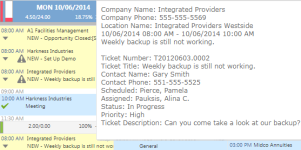 En calendarios, las llamadas de servicio aparecen con un fondo amarillo. Un ícono para expandir le permite ver los títulos de tickets y tareas programados en la llamada de servicio. Al desplazar el cursor sobre la llamada de servicio, se abrirá un cuadro de información sobre herramientas.