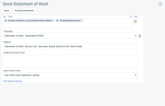Cuando haga clic en Generar y enviar en la página Nueva llamada de servicio, Editar llamada de servicio o en cualquier lista de llamadas de servicio, se abrirá la página Enviar Declaración de trabajo. Esta página le permite generar el correo electrónico de notificación al que se adjuntará el archivo adjunto de la Declaración de trabajo.