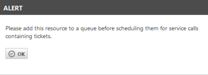 Usted no puede volver a asignar un ticket a un recurso que no esté asignado al menos a una cola Si usted arrastra un ticket o una llamada de servicio que contenga un ticket al programa de un recurso que no esté asignado a una cola de Atención al cliente, se abrirá este mensaje de error para recordarle que usted debe agregar el recurso a una cola de Atención al cliente.