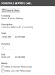Si usted usa arrastre y colocación para re-programar una llamada de servicio en su calendario, usted verá la ventana emergente Programar llamada de servicio. Sin embargo, la casilla de verificación Notificar a los recursos asignados solo aparece si hay otros recursos asignados a tickets o tareas en la llamada de servicio que usted está re-programando.