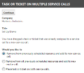 Cuando suelte el ticket en el nuevo intervalo, se abrirán consecutivamente uno o más cuadros de mensajes. Los mensajes variarán dependiendo de diversos factores: si usted está arrastrando a una llamada de servicio existente o un intervalo de tiempo vacío, si el intervalo está en el programa de un recurso ya asignado a la tarea, o si usted está arrastrando a la misma llamada de servicio en el calendario de un recurso diferente.