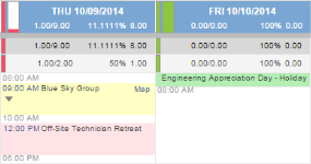 Su calendario de Autotask y el Calendario de distribución usan codificación por color y métricas de utilización para ayudarle a rápidamente distinguir entre tipos de elementos de programa y ver quién tiene tiempo libre. Los gráficos a continuación le ayudarán a entenderlos.