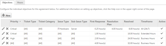 EJEMPLO En este ejemplo de SLA, un ticket con prioridad Crítica, un tipo de problema IT:Hardware, y un tipo de sub-problema de Servidor coincide con ambos objetivos críticos, pero es una coincidencia más específica para el primer objetivo.
