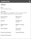 La página Detalles del cargo/gasto es de solo lectura. Presenta detalles del elemento seleccionado, incluidos los cargos y los gastos que hayan sido aprobados y contabilizados.