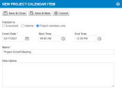 La página Calendario del proyecto permite añadir un elemento al calendario del proyecto. Para abrir la página, utilice la ruta de acceso en la sección anterior Seguridad y navegación.