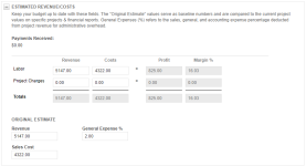 Al crear o editar el proyecto, usted puede ingresar sus expectativas financieras para el proyecto en los campos Ingresos, Costo de ventas y % de gasto general. Los valores de Estimado original actúan como base de referencia y se comparan con los números actuales que usted puede ingresar en los campos Ingresos y Costos de Mano de obra y Cargos de proyecto. Totales, Ganancias y % de margen se calculan automáticamente.