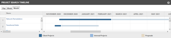 El nombre de cada proyecto en los resultados de búsqueda aparece en la lista a la izquierda. A la derecha, una barra coloreada representa cada proyecto. La barra se extiende desde la fecha de inicio hasta la fecha de finalización. El color más oscuro indica qué porcentaje del proyecto se ha completado. El color de la barra indica el tipo de proyecto. La clave de color aparece debajo del programa. NOTA No es posible crear un nuevo proyecto en la vista de cronograma. Haga clic en el ícono de la vista de lista para volver a la vista de elemento. |