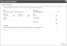 El asistente Guardar como plantilla de proyecto comienza con la página Información general. Esta página contiene los campos de Información general copiados desde el proyecto original, o bien copiados de la plantilla al nuevo proyecto.