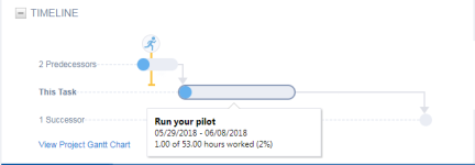 Cada escala de tiempo tiene una o más barras que representan la tarea actual y, cuando se aplique, tareas dependientes (anteriores o posteriores). El color de la barra de la tarea actual es azul-gris pálido, a menos que la tarea esté vencida (la fecha actual es posterior a la fecha de finalización de la tarea). En ese caso, el color es rojo-gris. Todas las tareas anteriores y posteriores se agrupan en una barra. La barra de tareas anteriores está arriba y a la izquierda de la barra de tareas actual, mientras que la barra de tareas posteriores está abajo y a la derecha. Las tareas dependientes son también azul gris, a menos que una o más de las tareas representadas por la barra esté vencida. En ese caso, la barra es roja-gris. Un área sólida de color azul brillante o rojo brillante de cualquier barra indica el número de horas trabajadas en la(s) tarea(s) en relación con el total de horas estimadas para la(s) tarea(s), incluida cualquier variación proyectada. Para tareas completadas, la barra entera es azul o roja. Desplace el cursor por encima de una barra de tareas o una barra de tareas dependientes para ver el nombre de la tarea, el número de horas trabajadas del total de horas de la tarea (el total de horas de la tarea son las horas estimadas más la desviación prevista) y las fechas de inicio y finalización. Cuando haya más de una tarea anterior o posterior, cada nombre de tarea se presenta junto con la fecha más temprana de las fechas de inicio de tarea y la fecha más reciente de las fechas de finalización de la tarea. Haga clic en una barra de tareas anteriores o posteriores para abrir una lista de tablas explorables de todas las tareas representadas por la barra. Un área sólida azul o roja brillante de cualquier barra indica el número de horas trabajadas en la tarea, en relación a las horas totales estimadas para la tarea. Para tareas completadas, la barra entera es azul o roja. |