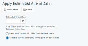 Fecha estimada de llegada. Puede especificar una fecha estimada de llegada en elementos de orden de compra. El campo Fecha de llegada estimada aparece en el formulario Memorando de la página Elemento de orden de compra. Existe también una ventana Fecha de llegada estimada que se abrirá cuando envíe una orden de compra. Desde esta ventana, usted puede especificar una fecha de llegada estimada para cualquier elemento en la orden de compra que no tenga una fecha especificada.