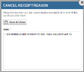 - Dependiendo de una configuración del sistema, es posible que se le pida ingresar un motivo por el que vaya a cancelar el recibo de un elemento de orden de compra, y puede requerirse la nota. Consulte Requerir/Pedir a los usuarios ingresar un motivo al actualizar manualmente la cantidad de disponibilidad de un elemento de inventario, o al cancelar el recibo del elemento de una orden de compra..