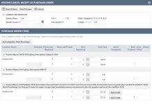 Cada vez que se abre y luego se guarda la página Recibir/Cancelar recibo de orden de compra, se genera un registro de transacciones que registra el estado y el número de elementos recibidos, incluso si no ha habido ningún cambio en estos campos. Usted puede recuperar estos registros en la página Historial de órdenes de compra.