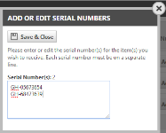 Si usted va a recibir productos serializados, haga clic en Agregar o editar en la columna Número(s) de serie para la ubicación interna o la ubicación del cliente. Esta acción abrirá el diálogo Agregar o Editar números de serie. Ingrese un número de serie para cada elemento recibido para esta ubicación de inventario (cada número de serie debe estar en una línea aparte) y luego haga clic en Guardar. NOTA Usted puede usar una opción de "emulación de teclado tipo Wedge" con un escáner de códigos de barras para ingresar números de serie rápidamente. IMPORTANTE El recuento en la columna Recibiendo ahora y la cantidad de números de serie que ingrese deben coincidir o, si no, no podrá guardar la página. |