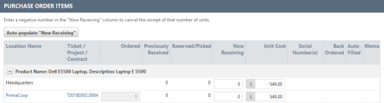 - Se abrirá la página Recibir/Cancelar recibo de orden de compra. La tabla Recibir Artículos de Orden de Compra ordena los artículos por Nombre de Producto, y dentro del nombre de producto por Ubicación de Inventario.