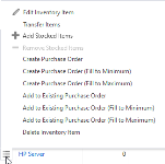 Estas opciones le permiten pedir rápidamente los productos de inventario seleccionados añadiéndolos a una orden de compra existente. Opcionalmente, la cantidad se ajusta a la diferencia entre la cantidad En existencia y la cantidad Mínima o Máxima de cada elemento. La cantidad predeterminada va a ser al menos una (1). Todas las órdenes de compra existentes que todavía están en estado Nuevo están disponibles para su selección. Para información detallada sobre cómo completar una orden de compra, consulte Agregar o editar una orden de compra. |